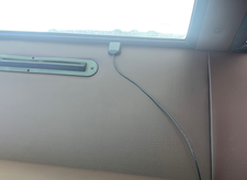 Monitor wiring… it came with an input cable taking RCA audio and video to the 1/8” plug on the monitor side. I taped off the RCA audio ends so they wouldn’t catch interference, and then taped the RCA video input to an adapter and then to the existing coax. Tucked most of that in the dash behind the end panel. For power supply – it came with a 110v wall mount supply that converts to 12v. I saved that aside and grabbed an old power supply I had here that fit the receiver on the monitor. I clipped that end and a couple feet of cord from the wall-plug portion. Tossed the wall plug. I could have easily done this same thing with the new one, but I figured I would use the old one just in case I have a warranty issue. The old monitor sourced power from a small distribution block on the outside of that dash end cover panel. I connected to that, preserving the inline fuse that was there just in case… Easy.