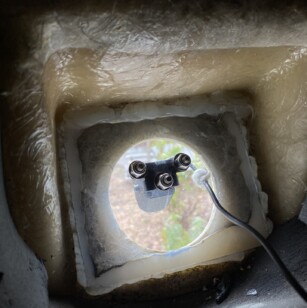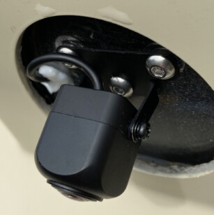 I was intending to mount the camera inside behind the clear cover using the old camera mounting bracket, so I opted for a camera with no IR emitters based on other’s comments about glare. My clear camera cover wasn’t perfectly clear and was collecting condensation. Bret suggested mounting it outside. Great idea. This was really easy – I just drilled through the clear plastic cover for the new camera mounting bracket and then another hole for the video cable. The plug is small so the wire hole is quite small (maybe ~3/16”). The larger diameter end of the connector stays inside. A little silicon sealed up around the wire. I used #10 stainless fasteners with nylon lock nuts on the camera bracket. There are several pics of this install.