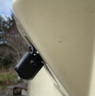 There’s a final pic of the monitor on. The white arc is the end cap, the thin blue line is the bumper, and that pergola is about 20’ away. Mounting the camera this way gives you a great angle for backing.
