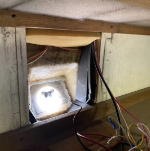 Our rear twin model has a storage cabinet that runs the width of the coach across the top of the rear cap. In the middle of that, there was a roughly 1’x1’ box that housed the old camera system. This was no longer needed and was easily removed (was halfway falling out already). The old access cover fits perfectly over the camera bubble space and holds in securely by friction. Super-easy and I didn’t need to build anything for this. See the pic of this space closed back up.