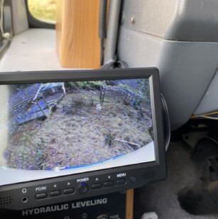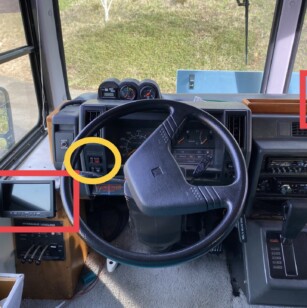 I’m not sure if our setup is typical, but our camera system is switched on via a dash switch – see the yellow circle – it’s the top switch. This same switch also powers the digital tach in that small secondary cluster.