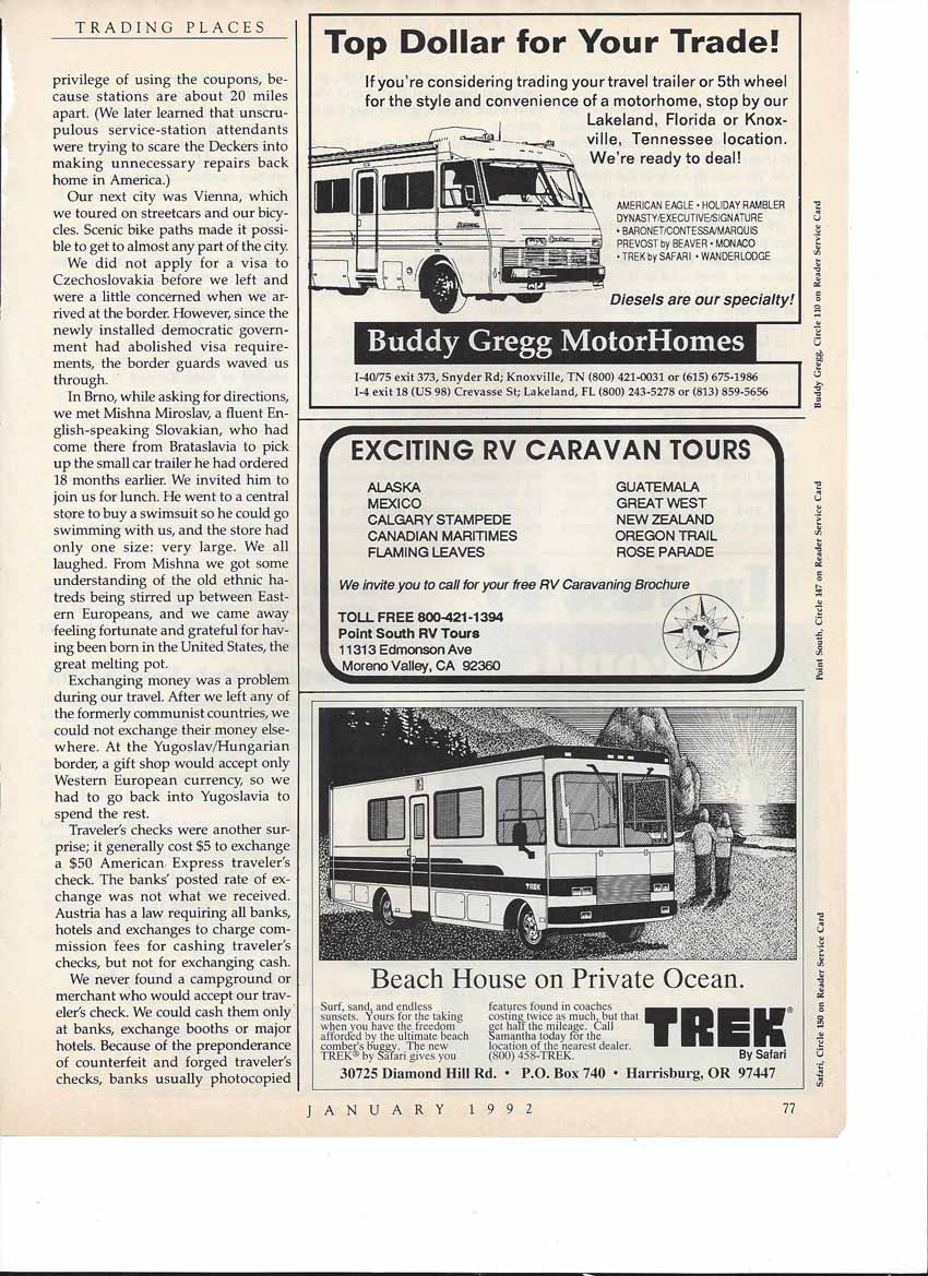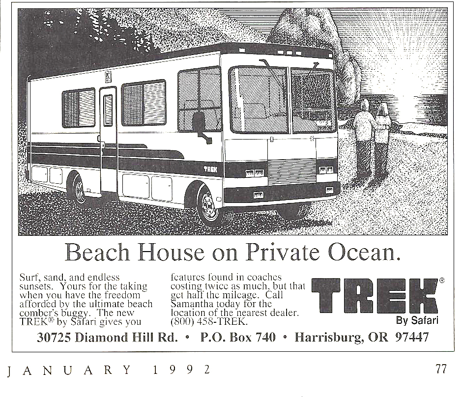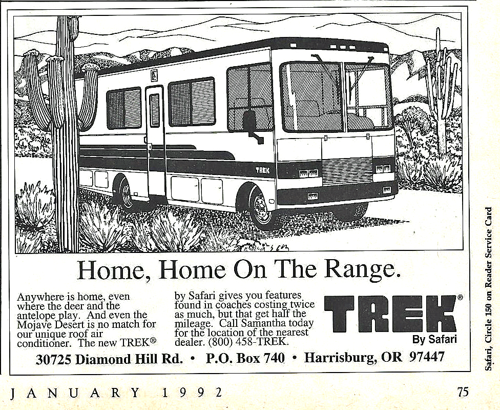 Full Page from Safari Magazine January 1992 issue. “The new TREK by Safari gives you features found in coaches costing twice as much, but that…